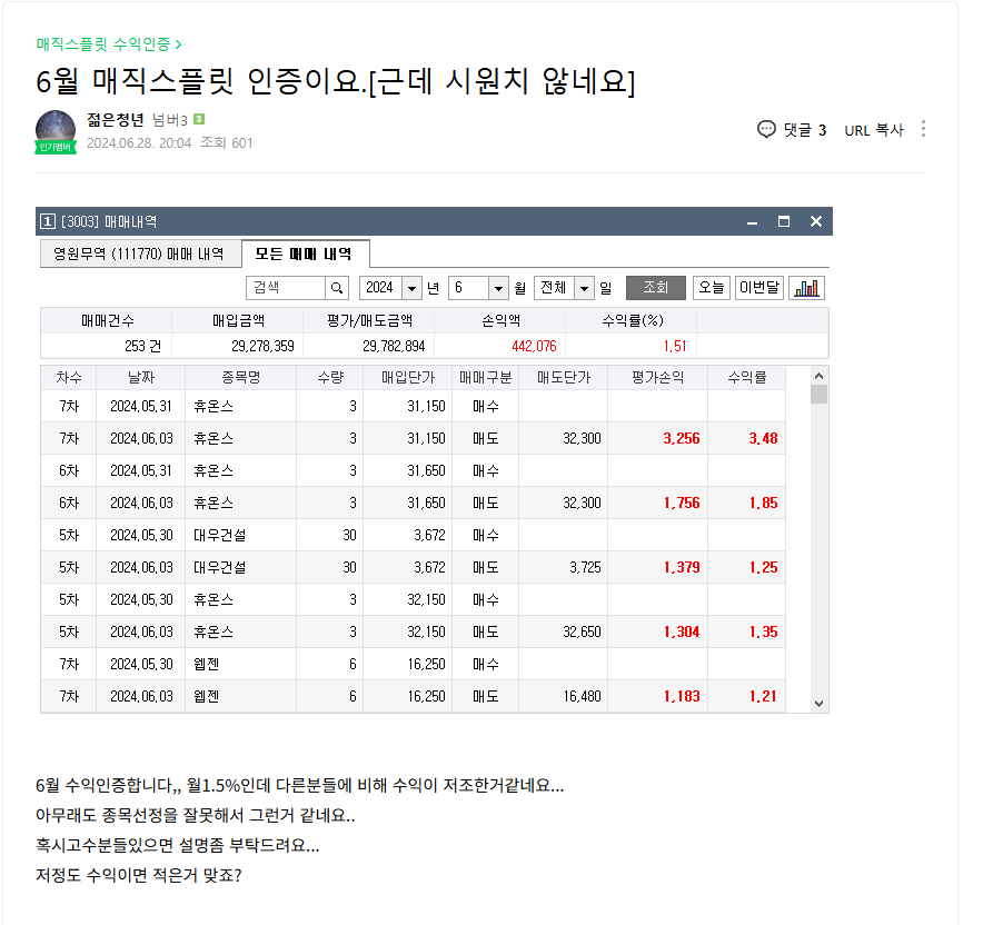 저 이 이미지 보시면 딱 1년전이네요 24.6.28일 보이시죠? 6월 전체 수익금액이 44만원이네요?